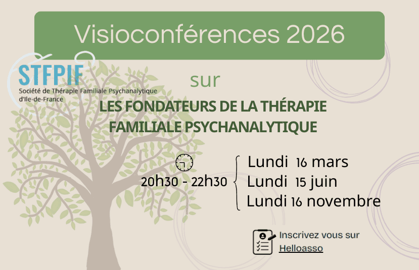 La STFPIF organise un cycle de visioconférences sur les thèmes : "Les thérapies multifamiliales", "Gérard Decherf, un passeur en psychanalyse familiale", "Les apports de José Bleger à la thérapie familiale psychanalytique"